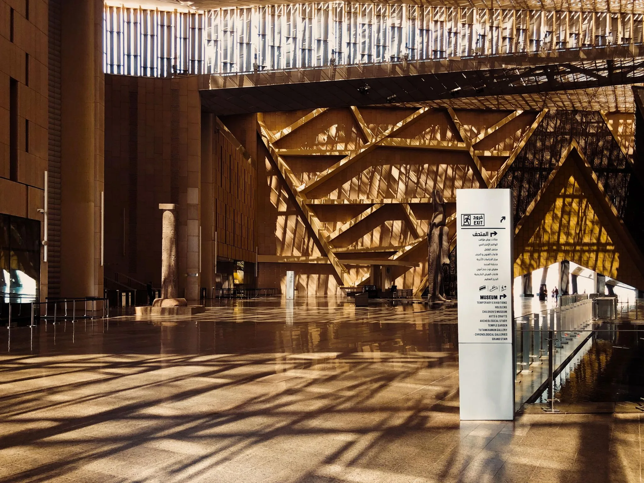 Il nuovo museo è colossale, con una superficie di 500.000 metri quadrati (5,4 milioni di piedi quadrati), circa le dimensioni di 70 campi da calcio. L’esterno è ricoperto di geroglifici e alabastro traslucido tagliato a triangoli, con un ingresso a forma di piramide. Tra le opere più importanti del GEM figurano un obelisco sospeso, lungo 16 metri e risalente a 3.200 anni fa, raffigurante il potente faraone Ramses II. E la sua imponente statua alta 11 metri. L’imponente statua fu spostata dalla stazione ferroviaria del Cairo nel 2006, in una complessa operazione di preparazione alla nuova istituzione.