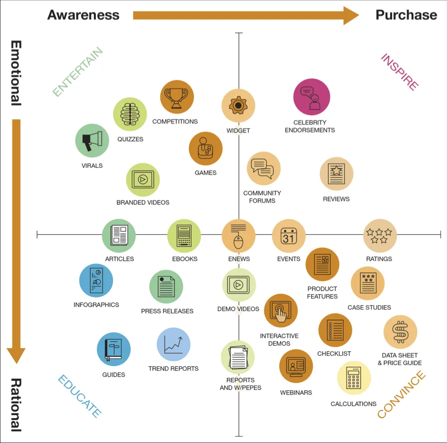 L’asse verticale, invece, è il tipo di contenuto, partendo da un approccio emozionale a uno più razionale.