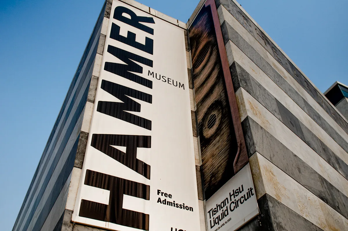 L’installazione nella hall dell’Hammer inaugura l’evento con un’atmosfera allegra. Dipinte su uno sfondo blu intenso, sono riprodotte le riproduzioni di tre murales realizzati da Alonzo Davis per le Olimpiadi estive del 1984 a Los Angeles. Un tempo costeggiavano l’Harbor Freeway nel centro della città. I pannelli colorati di Eye on ’84 (1984) sono pieni di cuori, occhi e cerchi olimpici. Sono uno sguardo al passato, a un’epoca più ottimistica, quando la città ospitò le sue seconde Olimpiadi (le prime si tennero nel 1932) e servono a ricordare le terze Olimpiadi, ormai prossime, del 2028.