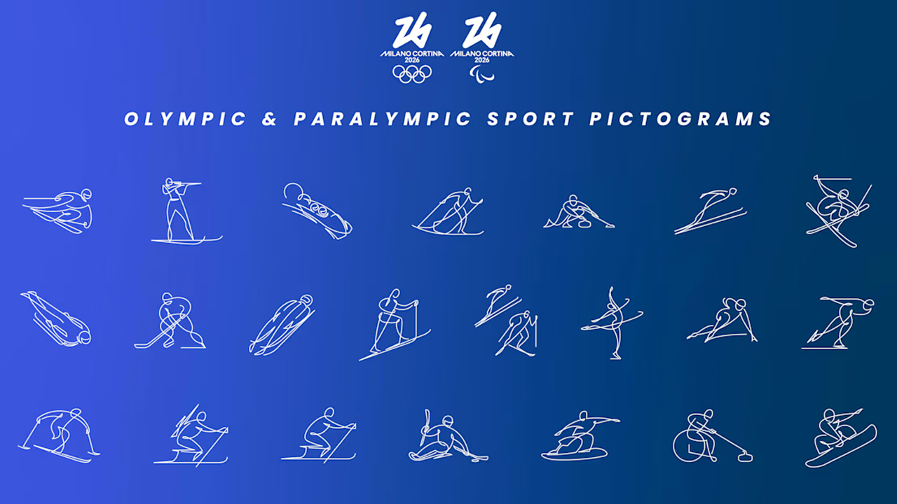 Un pittogramma per ogni sport: Biathlon, Biathlon paralimpico, Bob, Combinata nordica, Curling, Hockey su ghiaccio, Para ice hockey, Pattinaggio di figura, Pattinaggio di velocità, Salto con gli sci, Sci acrobatico, Sci alpinismo, Sci Alpino, Asci alpino paralimpico, sci di fondo, sci di fondo paralimpico, short track, skeleton, slittino, snowboard, snowboard paralimpico, wheelchair curling.