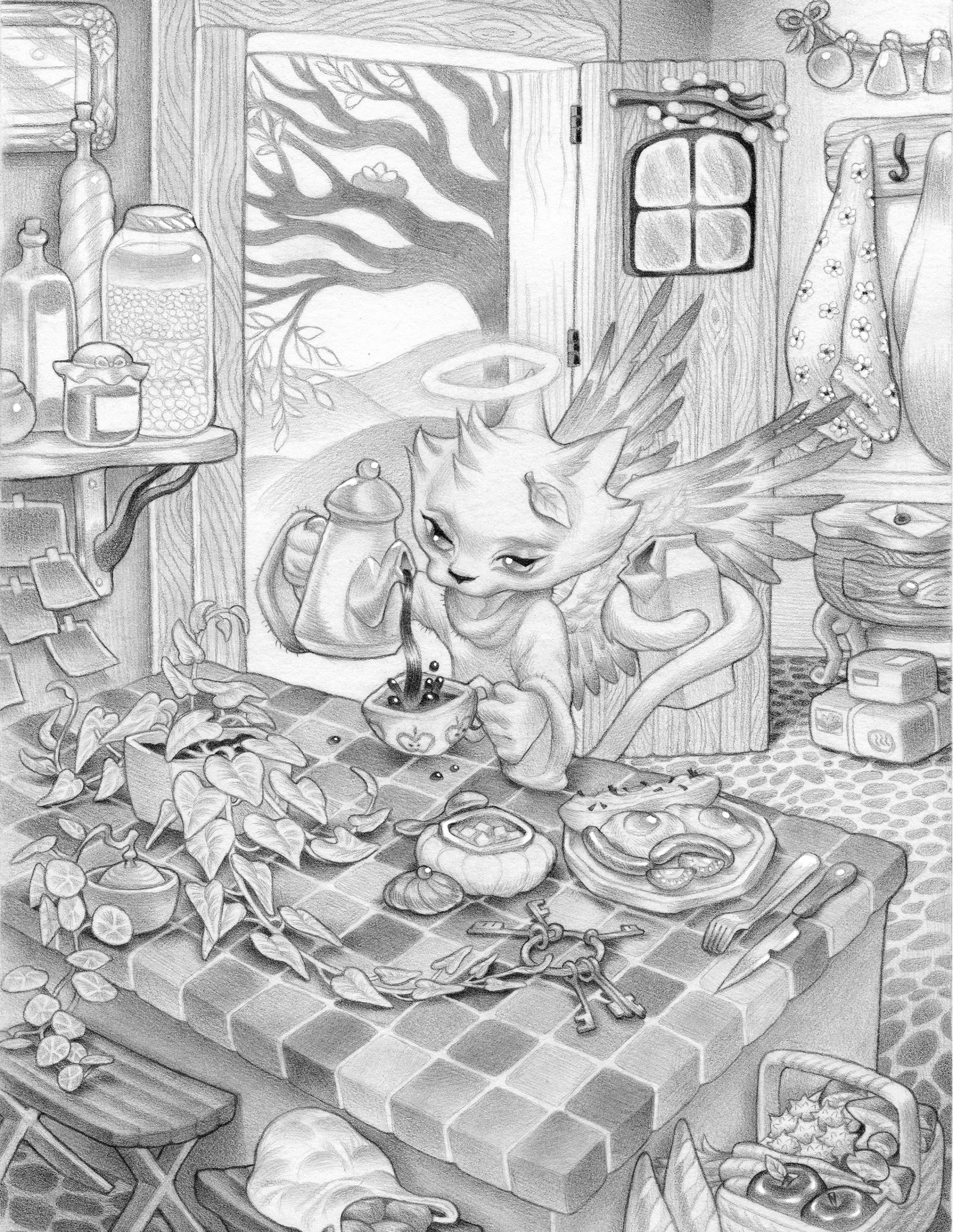 “Groggy Mornings” di Kouldelka raffigura “Un gatto angelo assonnato inizia la giornata nella sua casa accogliente e disordinata. Adoro illustrare i rituali silenziosi e la sensazione di quiete mattutina. Ho tratto ispirazione dal manga Haibane Renmei e dalla campagna europea.”